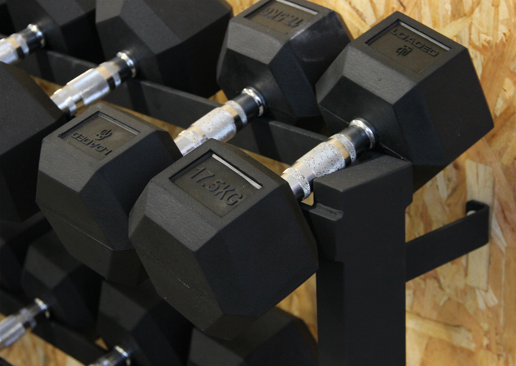 Cabeças hexagonais revestidas de borracha preta com indicações de peso em relevo